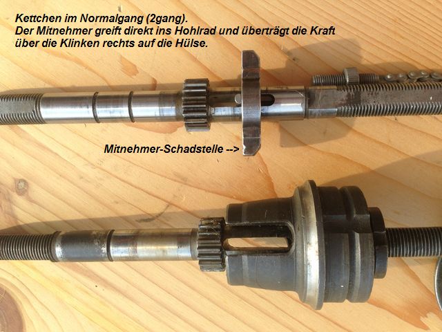 Womit (in einer konstruktiv kleineren Nabe) eine Uebersetzung ins Langsame und Schnelle moeglich wird.